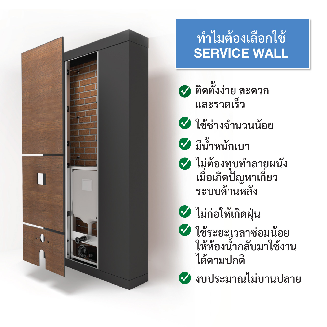 Service Wall คือระบบผนังหลังโถสุขภัณฑ์ ที่ได้รับการออกแบบมาเพื่องานดูแลรักษาและซ่อมบำรุงโดยเฉพาะ ใช้วัสดุและโครงสร้างที่แข็งแรง ติดตั้งง่าย และมีระบบแผงเปิด-ปิดแบบซ่อน จึงเข้าถึงระบบภายในได้ทันทีเมื่อต้องการ