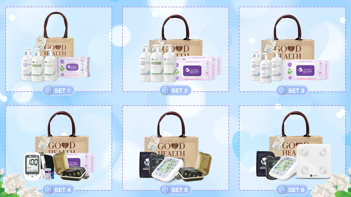 ชุดของขวัญวันแม่เพื่อสุขภาพ ของ ALLWELL นี้ ออกแบบมาเพื่อดูแลสุขภาพได้ทุกคนในครอบครัว โดยคัดสรรอุปกรณ์วัดสุขภาพที่จำเป็น รวมทั้งสินค้าเพื่อใช้สำหรับการดูแลร่างกายในทุกวัน ๆ อาทิ เครื่องวัดความดันโลหิต, เครื่องวัดระดับน้ำตาลในเลือด, เครื่องชั่งน้ำหนัก , โลชั่นบำรุงผิว , เซตแชมพูและครีมนวดบำรุงผม ฯลฯ โดยมีให้เลือกหลากหลายรูปแบบตามความต้องการ