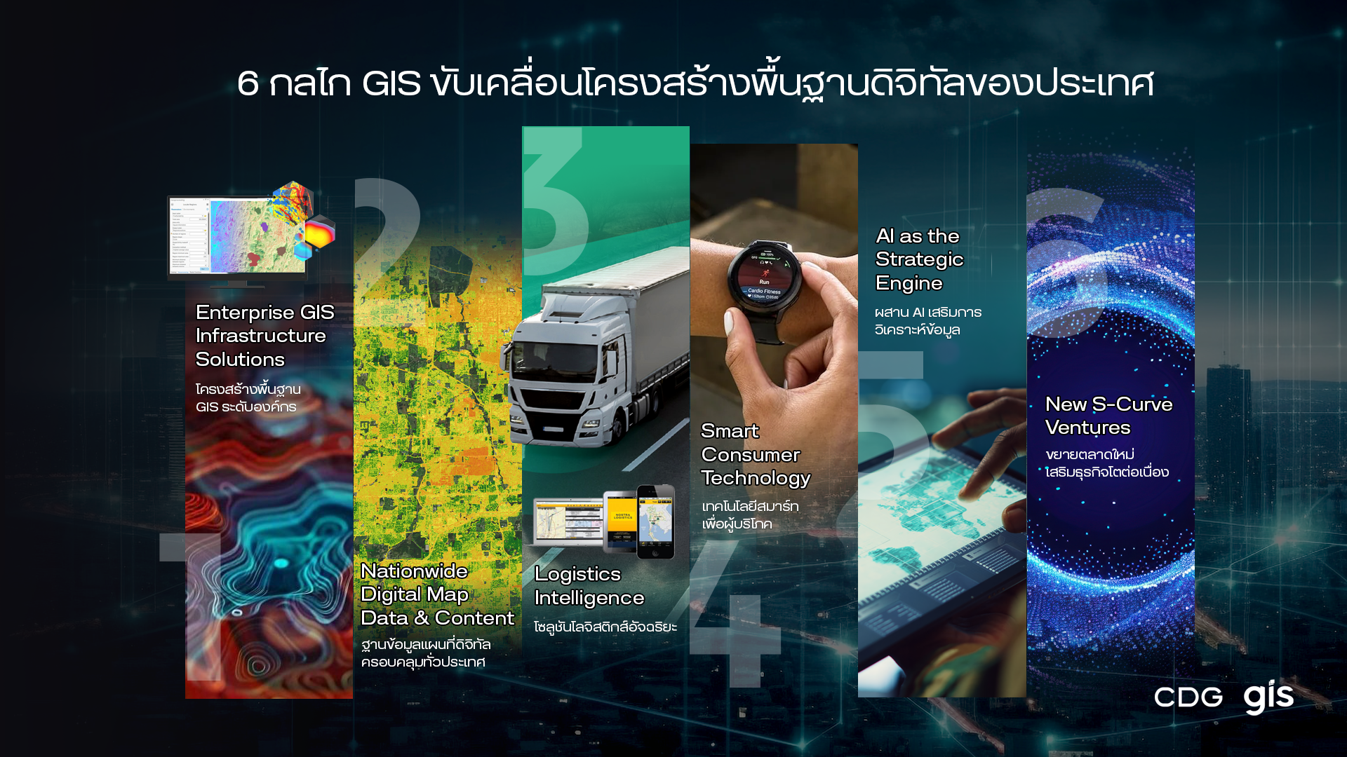 - GIS Driver 6: New S‑Curve Ventures: ขับเคลื่อนการเติบโตระยะยาวด้วยการต่อยอดความเชี่ยวชาญด้านเทคโนโลยี GIS สู่ตลาดต่างประเทศ พร้อมขยายบทบาทสู่การเป็นพันธมิตรทางเทคโนโลยีในระดับสากล ควบคู่กับการสำรวจและพัฒนาธุรกิจใหม่ที่ต่อยอดจากศักยภาพของ GIS เพื่อสร้างโอกาสทางธุรกิจใหม่และเสริมขีดความสามารถขององค์กรในอนาคต